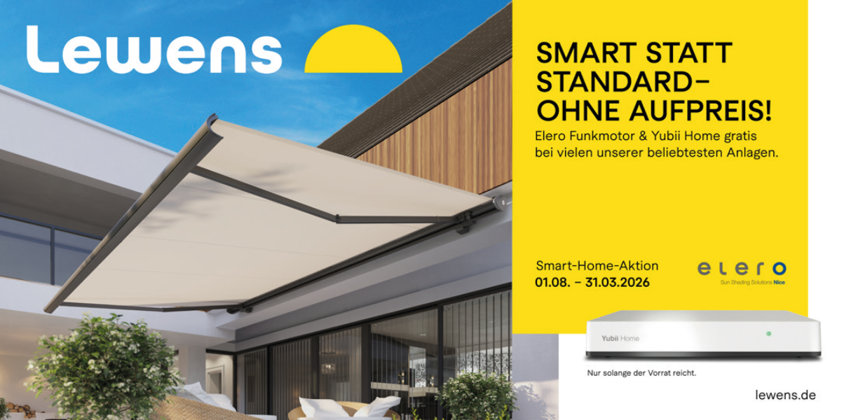 Beim Kauf einer Aktions - Gelenkarmmarkise oder einer Aktions-Markise für Glasdächer erhalten sie Elero Funktomtor, Funkfernbedienung und die Yubii Home Smart - Home - Steuerung - zum Preis eines Standardmotors!